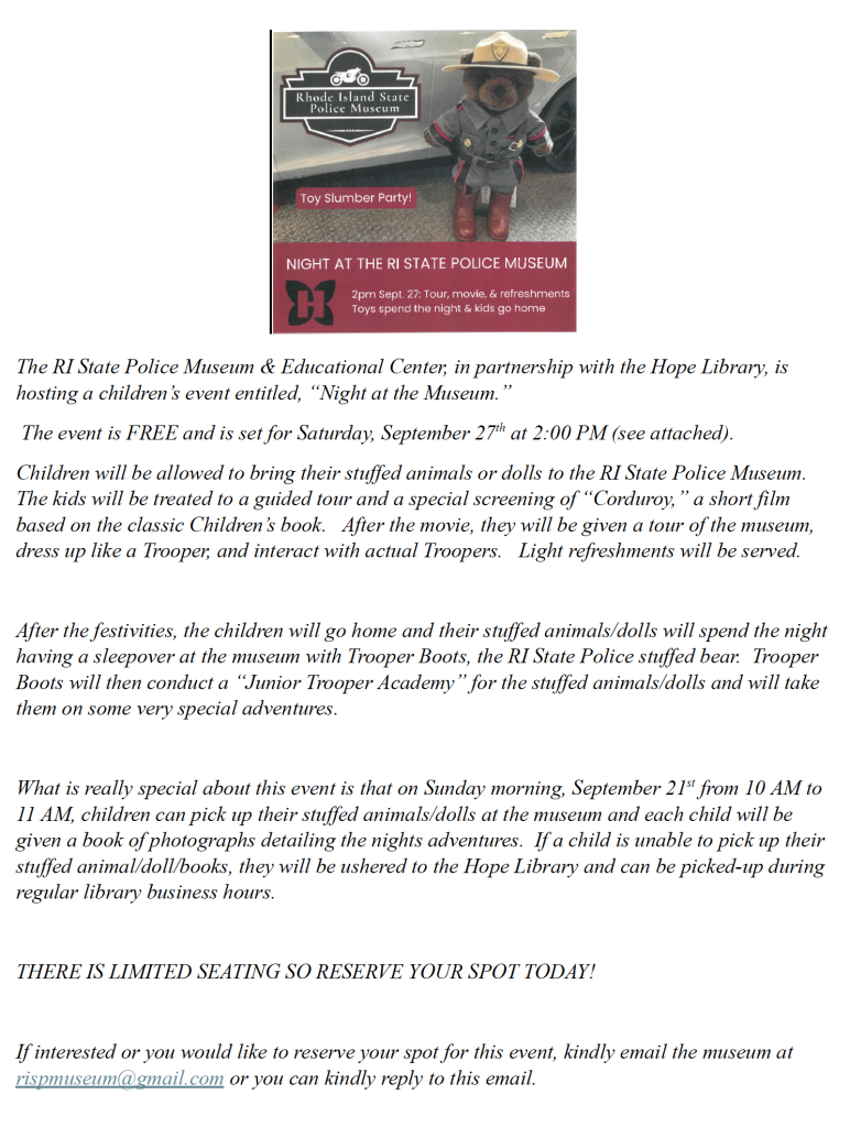 Members of the Rhode Island State Police Museum Foundation Executive Board recently visited the Massachusetts State Police Museum and Learning Center to see their new facility. We would like to thank them for the tour as well as the time they spent with us sharing information and resources. Our new Rhode Island State Police trooper bear also enjoyed many of the displays. The bear will be available to purchase soon, but the bear needs a name! We will be taking suggestions to name the trooper bear at the upcoming Vintage Cruiser Show on Sunday, September 18thfrom 10:00 a.m. to 2:00 p.m. at State Police Headquarters, 311 Danielson Pike, North Scituate. Please come and enjoy the cruiser show and help us decide on a name for our new bear.